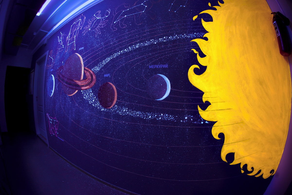 In normal light children see the sun, planets, a scattering of stars with the names of constellations and an astronaut in a spaceship.